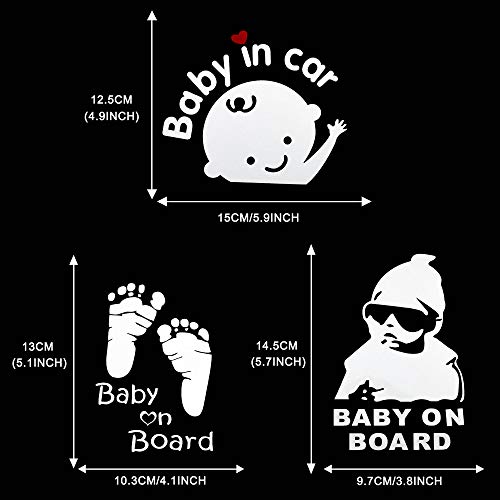 Dimensioni adesivi - le dimensioni degli adesivi sono 4,9 * 5,9 pollici / 5,1 * 4,1 pollici / 5,7 * 3,8 pollici. Il pacchetto include: 3 * adesivi per auto Baby on Board.