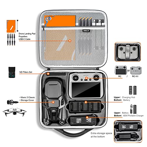 Grande capacità: questa custodia per Mavic 3 Classic/Mavic 3 è in grado di contenere un drone, controllo RC/RC-N1 (ne tiene solo uno allo stesso tempo), batteria di volo intelligente, caricabatterie portatile da 65 W, cavi, eliche, schede SD, filtri e molti altri accessori per droni.