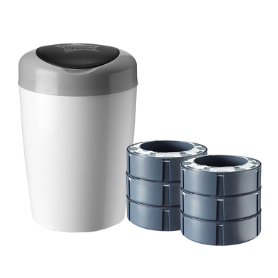 Il cestino per pannolini Simple e Sangenic di Tommee Tippee è il modo semplice, elegante e poco ingombrante per mantenere la stanza del vostro bambino pulita e inodore. Il cestino per pannolini è adatto per lo smaltimento di pannolini, batuffoli di cotone, salviettine per bambini e prodotti per l'igiene. La pellicola multistrato e l'intelligente chiusura a lembo sigillano il coperchio in tutti gli odori. La pellicola contiene un agente antibatterico che elimina il 99% di tutti i germi. Ogni confezione di ricarica è sufficiente per lo smaltimento di un massimo di 180 pannolini. Dettagli del prodotto: Il contenitore può contenere fino a 18 pannolini alla volta Design: bianco / grigio Pulizia: Basta pulire con acqua tiepida e sapone La pellicola multistrato intrappola tutti gli odori La pellicola contiene un agente antibatterico La pellicola multistrato e il coperchio a tenuta intelligente sigillano gli odori sgradevoli. La pellicola contiene un agente antibatterico che elimina il 99% dei germi. Ogni confezione di ricarica è sufficiente per lo smaltimento di un massimo di 180 pannolini*. *Per la misura del pannolino 1 (2-5 kg). Dettagli del prodotto: Per i più alti standard di igiene Bastano fino a 180 pannolini La pellicola contiene un agente antibatterico Uccide il 99% di tutti i germi La protezione antibatterica è attaccata alla pellicola e non a qualsiasi altro componente del prodotto. La pellicola intrappola i germi e gli odori e ne impedisce la diffusione in casa. Ambito di consegna: 1 x Tommee Tippee Secchio per pannolini Sangenic Simple e 6 x cassetta a foglio