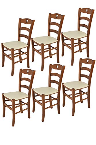 T m c s Tommychairs - Set 6 sedie modello Cuore per cucina bar e sala da pranzo, robusta struttura in Legno di faggio color noce chiaro e seduta rivestita in pelle artificiale color avorio