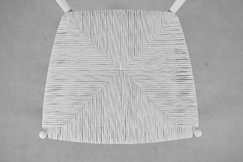 MATERIALE: resistente struttura in acciaio verniciato in bianco. DIMENSIONI: altezza totale 87 cm, larghezza totale della sedia 42 cm, profondità totale della sedia 43 cm, profondità della seduta 37 cm, altezza della seduta 46 cm. Dal momento che è un prodotto artigianale, le misure possono variare leggermente. PORTATA: max. 90 kg con peso uniformemente distribuito sul sedile.