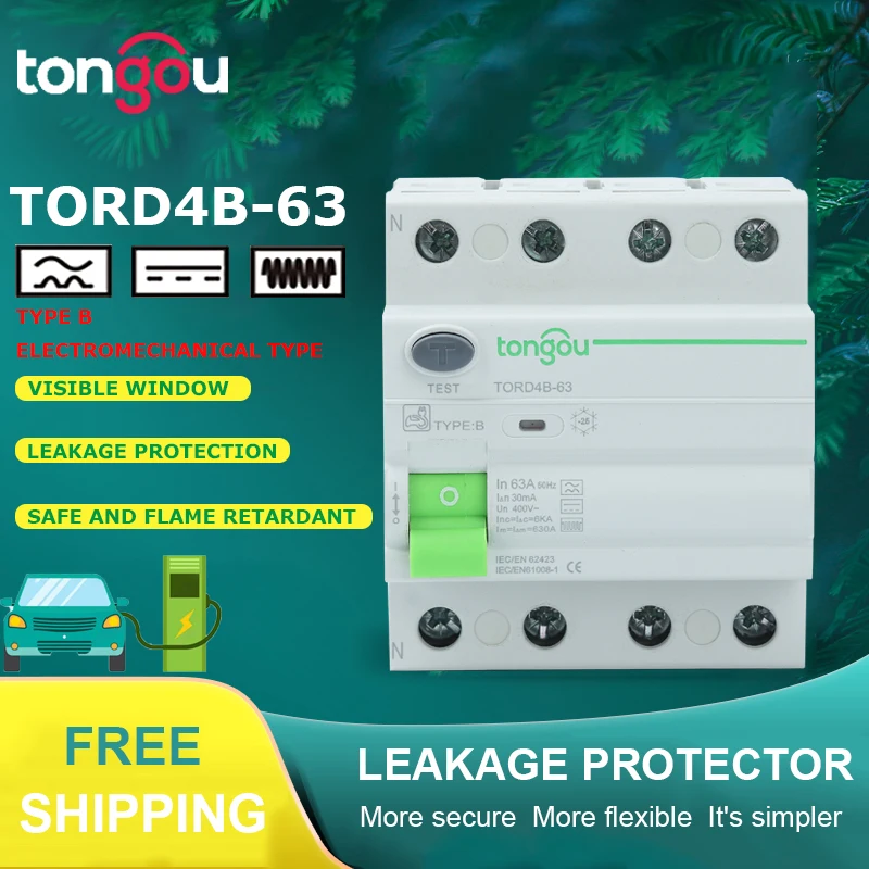 TONGOU Din Rail Earth Leakage Current breaker DC RCCB RCD 4P 63A 30mA 300mA Type B 6KA