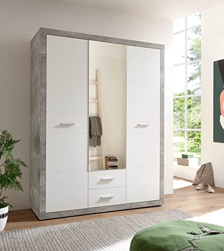 Tonino - armadio elegante molto spazioso con specchio, multiuso e moderno con ante battenti in grigio cemento e bianco. Dimensioni LxAxP ca. 151x198x55 cm