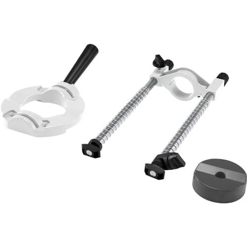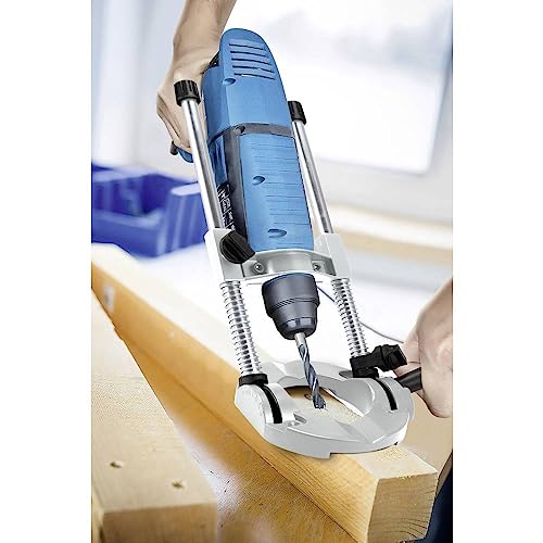 Per macchine con collare di serraggio Ø 42 mm · Impugnatura per un posizionamento preciso e una tenuta durante la foratura · Supporto per foratura orizzontale, verticale o ad angolo. · Le guide sono dotate di una sospensione per un rapido movimento all'indietro in caso di fori ripetuti. · La sospensione scorre da sola su e giù sulle guide. · I fori angolari fino a 45 gradi e i tamponi in gomma sul piede garantiscono una buona tenuta. · Adatto per tutti i trapani da 6.350 mm o 9.525 mm