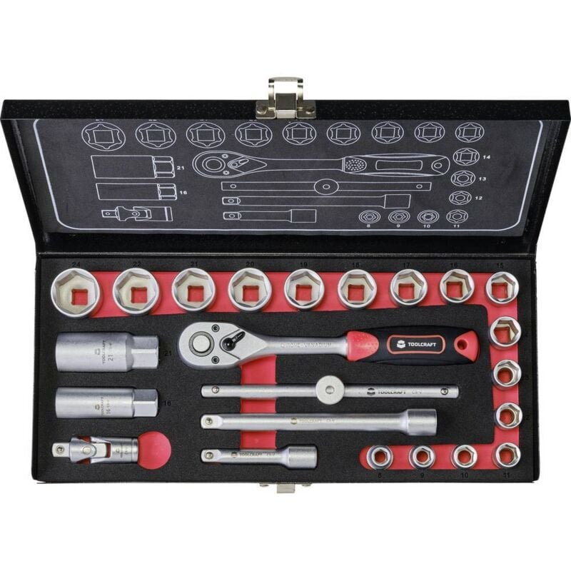 Dettagli tecnici Contenuto 1 KIT Funzione metrico Impronta (cacciavite) 3/8 (10 mm) Materiale Acciaio al cromo vanadio Tipo prodotto Kit di chiavi a bussola Kit chiavi a bussola 10 mm (3/8) 23 pz. La trasmissione di potenza delle brugole viene trasmessa alla testa della vite non dagli angoli ma dai fianchi. Viene così garantita una maggiore trasmissione della potenza, mentre gli spigoli sensibili del dado restano inalterati. Punti di forza e dettagli 10 mm (3/8): cricchetto 16 inserti per chiavi a bussola 2 prolunghe (75 e 150 mm) Giunto cardanico 2 inserti per candele d'accensione da 16 e 21 mm Caratteristiche Acciaio al cromo vanadio Cricchetto con sblocco dello strumento applicato tramite pressione di un pulsante Testa a T scorrevole. Incluso nella consegna 10 mm (3/8): cricchetto 16 inserti per chiavi a bussola da 8 a 24 mm 2 prolunghe (75 e 150 mm) Giunto cardanico 2 inserti per candele d'accensione da 16 e 21 mm Robusto contenitore in acciaio, gli utensili sono collocati in