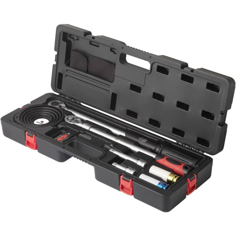 Dettagli tecnici Caratteristiche chiave dinamometrica con cricchetto telescopico reversibile Dimensione del prodotto, larghezza 280 mm Dimensione del prodotto, lunghezza 520 mm Dimensioni prodotto Altezza 100 mm Forza 1/2 (12.5 mm) Momento torcente (min.) 40 Nm Momento torcente max. 210 Nm Peso 5.9 kg Tipo prodotto Set di chiavi dinamometriche professionali Punti di forza e dettagli Contiene una chiave dinamometrica professionale con 40 - 210 Nm, un cricchetto telescopico professionale da 460 a 600 mm e 2 inserti avvitatori a percussione a parete sottile: 17 e 19 mmInoltre, è incluso un misuratore di profondità del battistrada per pneumatici, 2 prolunghe da 75 e 125 mm e una ciotola magnetica pieghevole per dadi delle ruoteIl kit viene fornito in una robusta valigetta in plastica con cerniere in metallo Testo tradotto automaticamente Incluso nella consegna Manico a cricchetto estraibile 460 fino a 600 mm, materiale CR-V, superficie opaca 12,5 mm (1/2 pollice) estraibile., Chiave