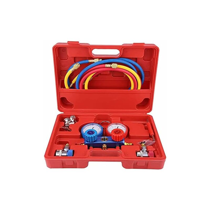 Robusti ganci per appendere lo strumento in modo sicuro, la pressione alta e bassa con codice colore può essere regolata a zero Include un tubo di ricarica a tre colori lungo 1,5 m, facile da usare. Il kit manometro R134a è ideale per test, riempimento e lo svuotamento dei condizionatori delle auto. Tubo flessibile di ricarica del refrigerante R134A di alta qualità con manometro, struttura robusta Il doppio manometro ampio e chiaro adotta un esclusivo manometro a molla per leggere i dati in modo più accurato