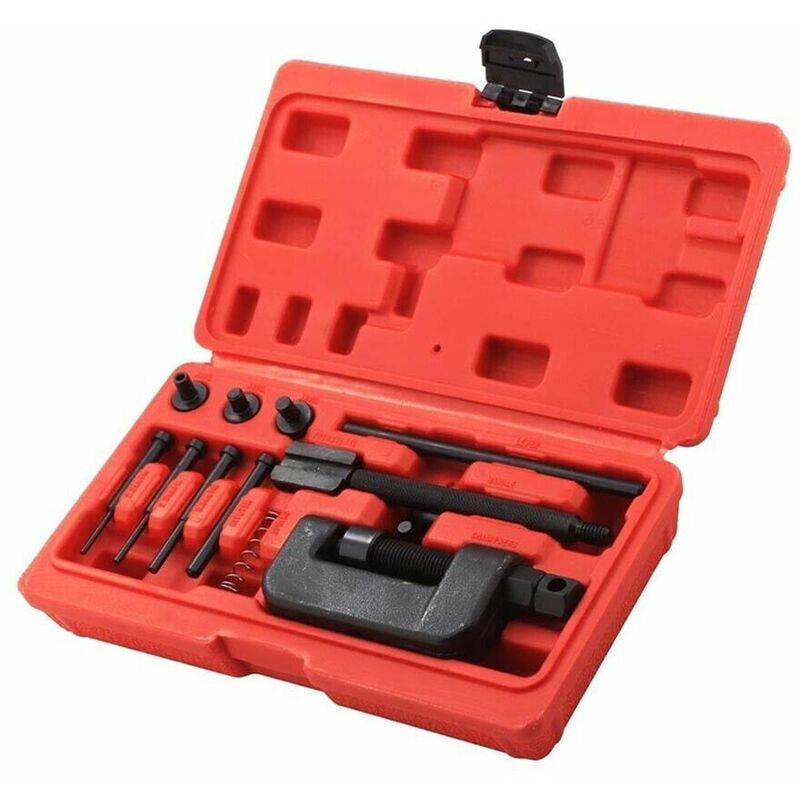 Kit riparazione smontaggio catene per bici biciclette e moto a catena Kit per smontaggio e riparazione catene per moto e biciclette può essere utilizzato anche come rivettatrice per catene di distribuzione. Il set contiene: N. 3 perni per crimpare e spezzare le catene N. 1 Mandrino per pressare i rivetti con una pressa N. 1 Molla e varie punte necessarie. Diametro albero 22 mm Diametro perno 29 mm Diametro asta 38 mm Il tutto racchiuso in valigetta di plastica