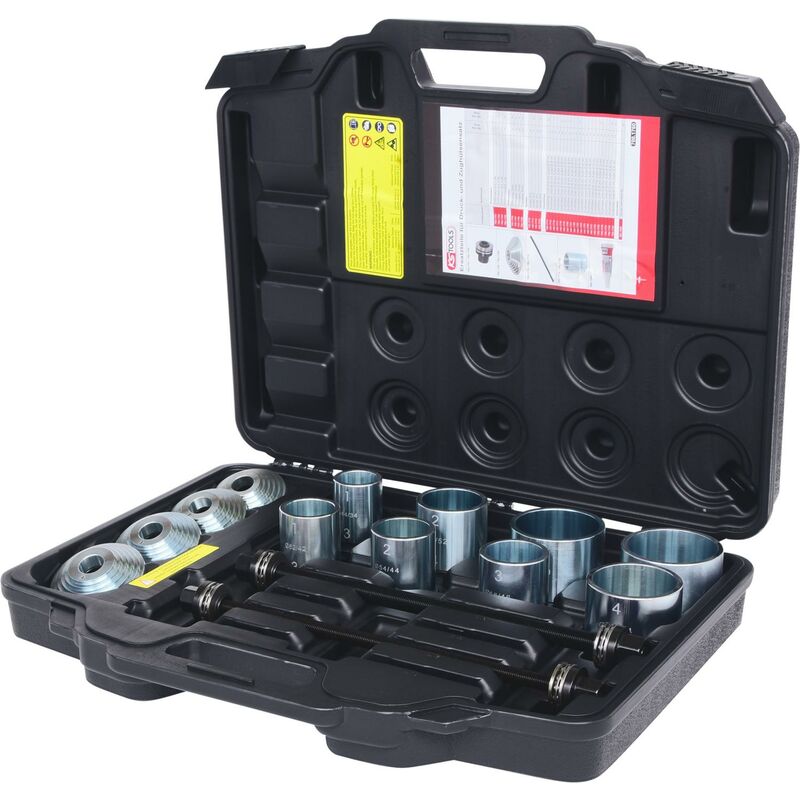 Per il montaggio e lo smontaggio sicuri di cuscinetti Ideale per silentblock, cuscinetti idraulici, boccole, cuscinetti, anelli di tenuta Simmerring, ecc. Utilizzo universale su automobili, autocarri, macchinari per servizi comunali, usi agricoli e forestali, ecc. Da utilizzare anche in combinazione con una pressa da officina o cilindro a stantuffo cavo In base al tipo di applicazione, ghiere e tiranti possono essere rifiniti anche singolarmente Il cuscinetto reggispinta protegge da forti attriti durante il processo di lavorazione In robusta valigetta di plastica Attenzione: Le viti di pressione devono essere lubrificate prima del primo impiego. Un sovraccarico porta ad un allungamento indesiderato del materiale, fino alla rottura Controllare la forza sull'azionamento sempre con una chiave dinamometrica. Coppie massime consentite: Vite di pressione M10x1,5 60 Nm Vite di pressione M12x1,5 100 Nm Vite di pressione M14x1,5 180 Nm Vite di pressione M16x1,5 250 Nm