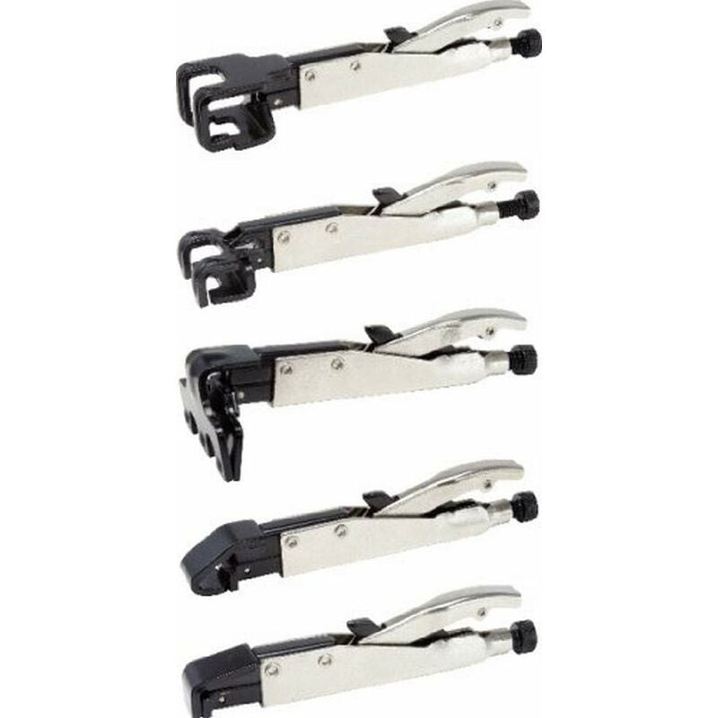 Descrizione Per lamiere sovrapposte Forma sottile Ganasce in acciaio speciale Con dispositivo di arresto Con leva di sgancio rapido Con regolazione a vite Per il serraggio ad angolo retto sulle pieghe della lamiera Utilizzabile in spazi difficili da raggiungere Per la saldatura a punti tra le ganasce Adatta anche per i profili a U Particolarmente adatte per la saldatura a punti Impugnatura nichelata Cromo-molibdeno