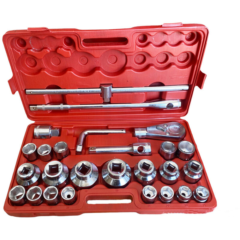 Set chiavi a bussola 26 pezzi 21-65mm per camion e trattori Pratico set di chiavi a bussola multigripIndicato per la manutenzione di camion, trattori e mezzi pesantiIdeale per qualsiasi meccanico o kit di primo intervento per agricoltoriIl kit è composto da 20 bussole con profilo interno tipo esagonale Misure: 21 - 22 - 23 - 24 - 26 - 27 - 28 - 29 - 30 - 31 - 32 - 34 - 36 - 38 - 41 - 46 - 50 - 55 - 60 - 65 mmAttacco: 3/4 per le bussole dalla 21 alla 50mm Attacco: 1/2 per le bussole dalla 55 alla 65mm Contenuto della confezione: 20 bussole esagonali1 riduttore 1 chiave a T 2 prolunghe 1 chiave a cricchetto reversibile 1 prolunga a L Prodotto di qualità LA FATTURA VIENE EMESSA PER ACQUISTI SUPERIORI A 20 € E VA RICHIESTA NEL MOMENTO DELL' ACQUISTO