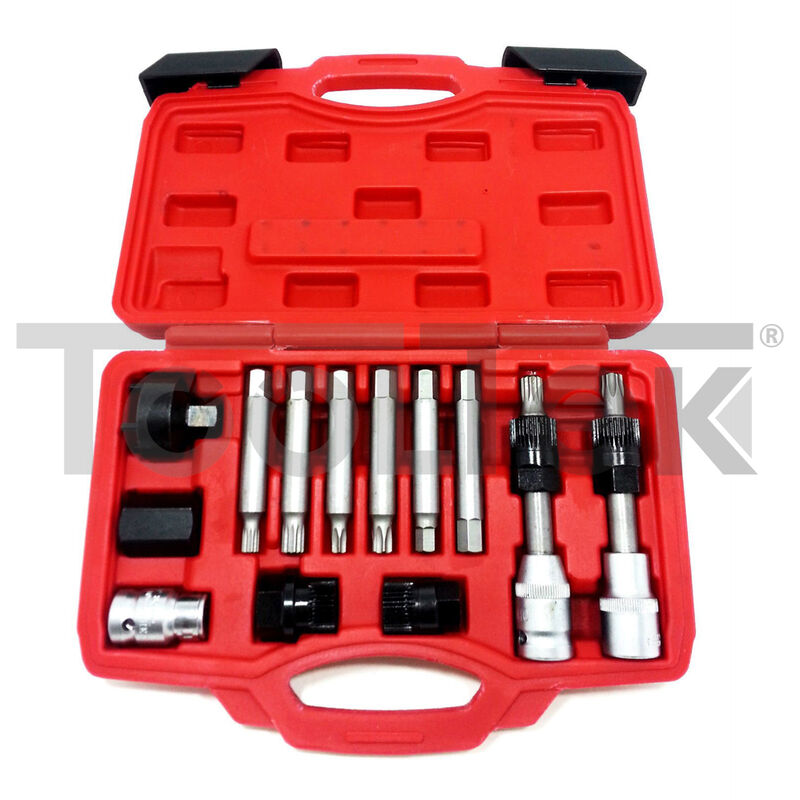 Kit smontaggio puleggia alternatore 13pz pezzi fiat opel ford bmw renault pro KIT SMONTAGGIO ALTERNATORE 13 PEZZI PRO Adatto per il montaggio e lo smontaggio delle pulegge a ruota libera per il cambio dell'alternatore e della puleggia - Permette lo svitamento ed il fissaggio del dado centrale della puleggia e dello stesso tempo di bloccare l'albero - Le diverse possibilità di combinazione consentono di evitare lo smontaggio di componenti supplementari come un radiatore, ecc Per l'uso con: alternatori Bosch e Magneti Marelli, Audi BMW, Fiat, Ford, Mercedes, Opel, Porche, Renauult, Peugeot, Seat, Skoda, VW, ecc IL KIT COMPRENDE 13PZ COME IN FOTO: - Chiave con attacco 1/2Torx T50x33 denti LUNGHEZZA 11CM - Chiave con attacco 1/2XZN - M10 X 33 denti LUNGHEZZA 11CM - Inserto speciale 10mm T40 x 75mm - Inserto speciale 10mm T50 x 75mm - Inserto speciale 10mm XZN M8 x 75mm - Inserto speciale 10mm XZN M10 x 75mm - Inserto speciale 10mm - esagonale 8mm x 75mm - Inserto speciale 10mm - esagonale