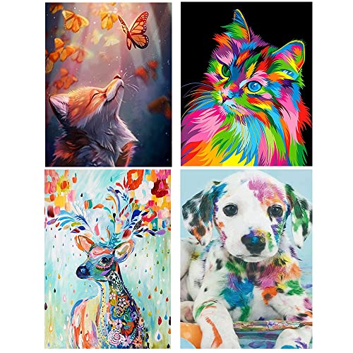 TOOSOAR 4 pezzi Diamond Painting,Diamond Painting Kit Completo,Diamond Painting Gatto,Cane, Volpe, Cervo, con attrezzi fai da te, per la decorazione della parete domestica (30x40cm, Trapano tondo)
