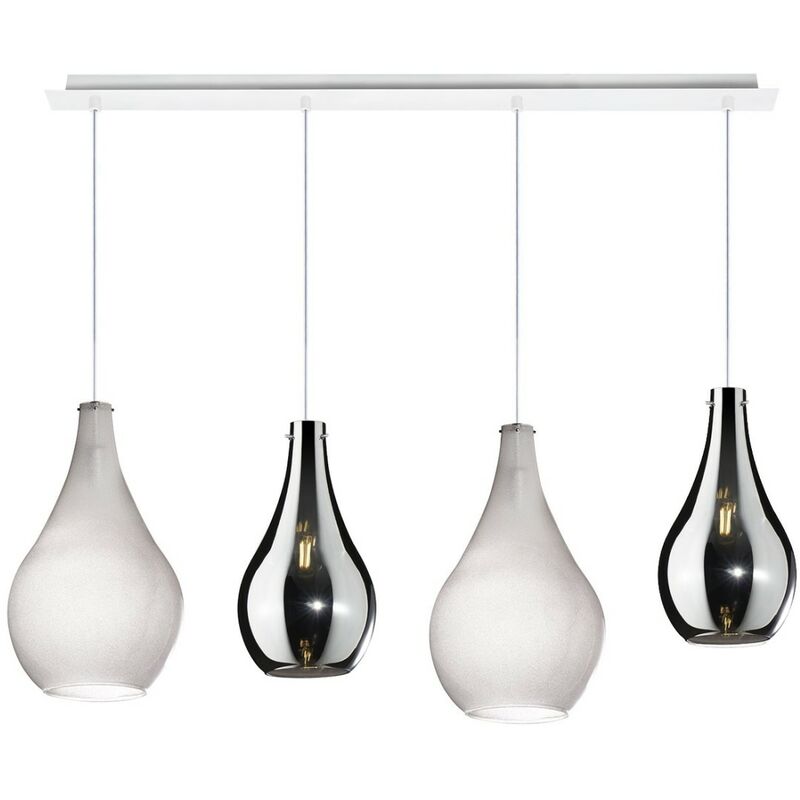 Plafoniera quattro luci realizzata con originali gocce in vetro soffiato che illuminano e al tempo stesso arredano la stanza. Una lampada da soffitto che esce dall'usuale grazie alla composizione di due vetri di dimensioni e colori diversi. Una plafoniera adatta per un arredamento moderno o dalle tonalità calde e accoglienti, come per il soggiorno, la camera matrimoniale, lo studio, la cucina, per la penisola o altra stanza dove la luce diventa l'unica protagonista di tutto l'ambiente. Plafoniera classica Top Light DROP 1134BI S4 RPM bicolore Lampada soffitto, vetri a goccia bicolore, graniglia, cromo lucido o rame, attacco E14 LED Emissione di luce DIFFUSA a seconda della colorazione del vetro. Il vetro graniglia diffonderà luce in modo omogeneo e grazie all'applicazione di granuli di vetro trasparente, una volta acceso, lo rendono brillante, invece i vetri colorati rame e cromo creeranno una luce d'atmosfera e d'effetto. L'accoppiamento dei vetri graniglia con quelli colorati è