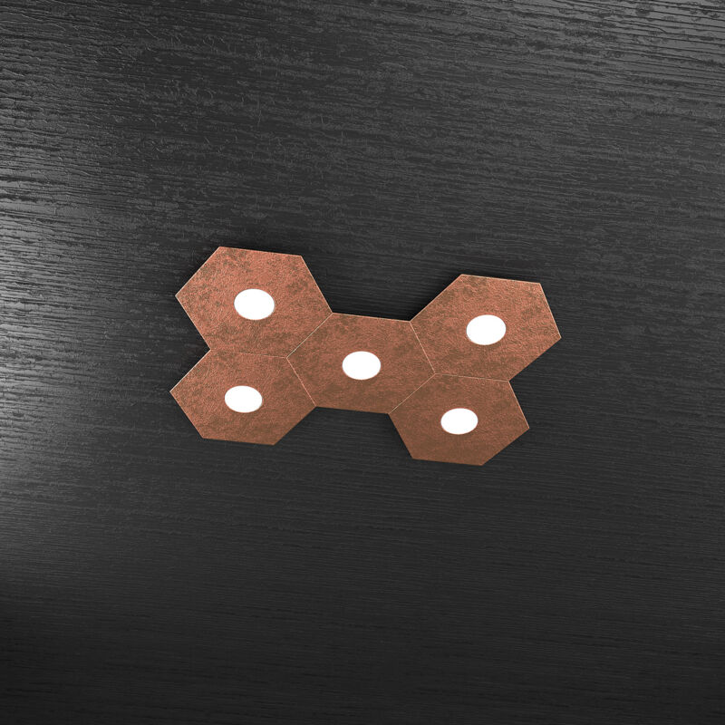 Collezione Hexagon IL FASCINO GEOMETRICO DELL'ILLUMINAZIONE LED Plafoniera 5 luci esagonale formata da lastre quadrate di metallo verniciato in finitura foglia rame.. I componenti base sono due: uno con sorgente luminosa (1142/1L) e uno solo decorativo (1142/1D). Questi componenti possono essere assemblati fra loro per creare infinite forme e mix di colori. Per comodità vengono proposti alcuni kit precomposti con codice dedicato. La presente collezione in quanto componibile è indicata per risolvere problemi di decentramento tra punto luce e zona da illuminare. Un altro punto di forza del prodotto consiste nel non utilizzare dei led integrati ma una lampadina Gx53 che, una volta montata, arriva a filo della lastra metallica e può essere facilmente sostituita dall'esterno. Esempi di composizioni aggiuntive possibili: I componenti esagonali luminosi (1142/1L) possono essere assemblati fra loro illimitatamente. Le due regole da rispettare sono: 1. Tra due esagoni luminosi (1142/1L) può