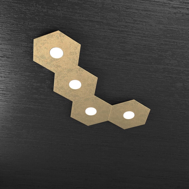 Collezione Hexagon IL FASCINO GEOMETRICO DELL'ILLUMINAZIONE LED Plafoniera 4 luci esagonale formata da lastre quadrate di metallo verniciato in finitura foglia oro.. I componenti base sono due: uno con sorgente luminosa (1142/1L) e uno solo decorativo (1142/1D). Questi componenti possono essere assemblati fra loro per creare infinite forme e mix di colori. Per comodità vengono proposti alcuni kit precomposti con codice dedicato. La presente collezione in quanto componibile è indicata per risolvere problemi di decentramento tra punto luce e zona da illuminare. Un altro punto di forza del prodotto consiste nel non utilizzare dei led integrati ma una lampadina Gx53 che, una volta montata, arriva a filo della lastra metallica e può essere facilmente sostituita dall'esterno. Esempi di composizioni aggiuntive possibili: I componenti esagonali luminosi (1142/1L) possono essere assemblati fra loro illimitatamente. Le due regole da rispettare sono: 1. Tra due esagoni luminosi (1142/1L) può