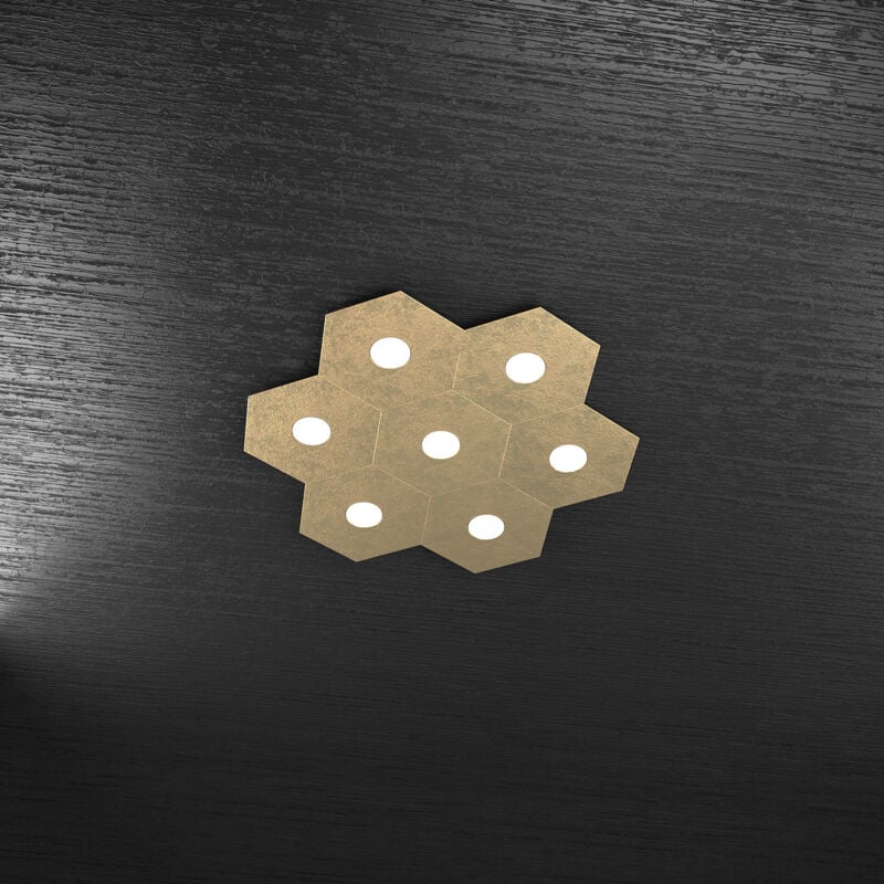 Collezione Hexagon IL FASCINO GEOMETRICO DELL'ILLUMINAZIONE LED Plafoniera 7 luci esagonale formata da lastre quadrate di metallo verniciato in finitura foglia oro.. I componenti base sono due: uno con sorgente luminosa (1142/1L) e uno solo decorativo (1142/1D). Questi componenti possono essere assemblati fra loro per creare infinite forme e mix di colori. Per comodità vengono proposti alcuni kit precomposti con codice dedicato. La presente collezione in quanto componibile è indicata per risolvere problemi di decentramento tra punto luce e zona da illuminare. Un altro punto di forza del prodotto consiste nel non utilizzare dei led integrati ma una lampadina Gx53 che, una volta montata, arriva a filo della lastra metallica e può essere facilmente sostituita dall'esterno. Esempi di composizioni aggiuntive possibili: I componenti esagonali luminosi (1142/1L) possono essere assemblati fra loro illimitatamente. Le due regole da rispettare sono: 1. Tra due esagoni luminosi (1142/1L) può