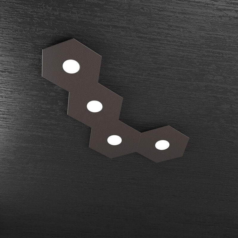 Collezione Hexagon IL FASCINO GEOMETRICO DELL'ILLUMINAZIONE LED Plafoniera 4 luci esagonale formata da lastre quadrate di metallo verniciato in finitura marrone.. I componenti base sono due: uno con sorgente luminosa (1142/1L) e uno solo decorativo (1142/1D). Questi componenti possono essere assemblati fra loro per creare infinite forme e mix di colori. Per comodità vengono proposti alcuni kit precomposti con codice dedicato. La presente collezione in quanto componibile è indicata per risolvere problemi di decentramento tra punto luce e zona da illuminare. Un altro punto di forza del prodotto consiste nel non utilizzare dei led integrati ma una lampadina Gx53 che, una volta montata, arriva a filo della lastra metallica e può essere facilmente sostituita dall'esterno. Esempi di composizioni aggiuntive possibili: I componenti esagonali luminosi (1142/1L) possono essere assemblati fra loro illimitatamente. Le due regole da rispettare sono: 1. Tra due esagoni luminosi (1142/1L) può