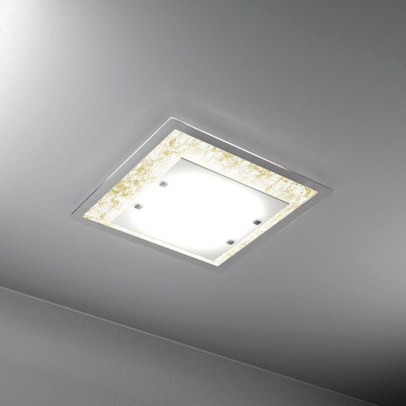 Collezione Tray L'ARTE DELL'ILLUMINAZIONE: UN TOCCO DI VETRO E LUCE Plafoniera con struttura metallica verniciata bianca e dettagli cromati.. Il diffusore è composto da due vetri in lastra extrachiaro, quello esterno in finitura foglia oro, quello centrale è serigrafato bianco.Questo articolo è disponibile in diverse finiture e/o dimensioni. E' possibile indicarlo nell'apposito campo NOTE presente in conclusione di ordine oppure contattarci dopo aver effettuatol'ordine.