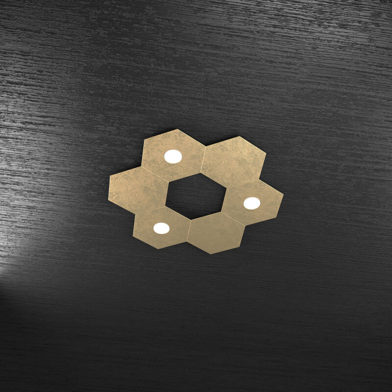 Collezione Hexagon IL FASCINO GEOMETRICO DELL'ILLUMINAZIONE LED Plafoniera esagonale formata da lastre quadrate di metallo verniciato in finitura foglia oro. Formata da 6 componenti, 3 con luce e 3 decorativi.. I componenti base sono due: uno con sorgente luminosa (1142/1L) e uno solo decorativo (1142/1D). Questi componenti possono essere assemblati fra loro per creare infinite forme e mix di colori. Per comodità vengono proposti alcuni kit precomposti con codice dedicato. La presente collezione in quanto componibile è indicata per risolvere problemi di decentramento tra punto luce e zona da illuminare. Un altro punto di forza del prodotto consiste nel non utilizzare dei led integrati ma una lampadina Gx53 che, una volta montata, arriva a filo della lastra metallica e può essere facilmente sostituita dall'esterno. Esempi di composizioni aggiuntive possibili: I componenti esagonali luminosi (1142/1L) possono essere assemblati fra loro illimitatamente. Le due regole da rispettare sono
