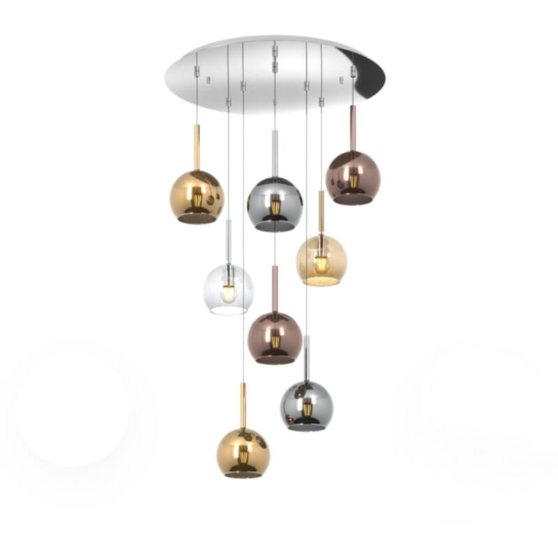 Piastra a otto luci rifinita con semplici vetri soffiati colorati per un'illuminazione uniforme in qualsiasi tipo di stanza. Una lampada da soffitto da regolare in altezza e creare un gioco sfalsato di calate che donano movimento all'ambiente. Una plafoniera da installare su qualsiasi piano d'appoggio o al centro della stanza. Plafoniera 8 luci Future 1155 S8 TP MC Top Light vetri soffiati colorati Lampada soffitto, multiluce con piastra tonda, vetro pirex colorato, diametro 15cm, E27 LED Lampade a sospensione composta da otto ampolle in vetro pirex soffiato regolabile in altezza. Struttura in metallo cromo lucido. La plafoniera è provvista di otto portalampade attacco E27 per lampadine a LED di qualsiasi wattaggio. Lampadine escluse. L'articolo FUTURE può essere personalizzato scegliendo tra i molti colori disponibili sia delle strutture (CR cromo, OS ottone satinato o BI bianco), sia dei vetri (TR trasparente, AM ambra, CR cromo, OR oro o RA rame) oppure vetri misti come TA