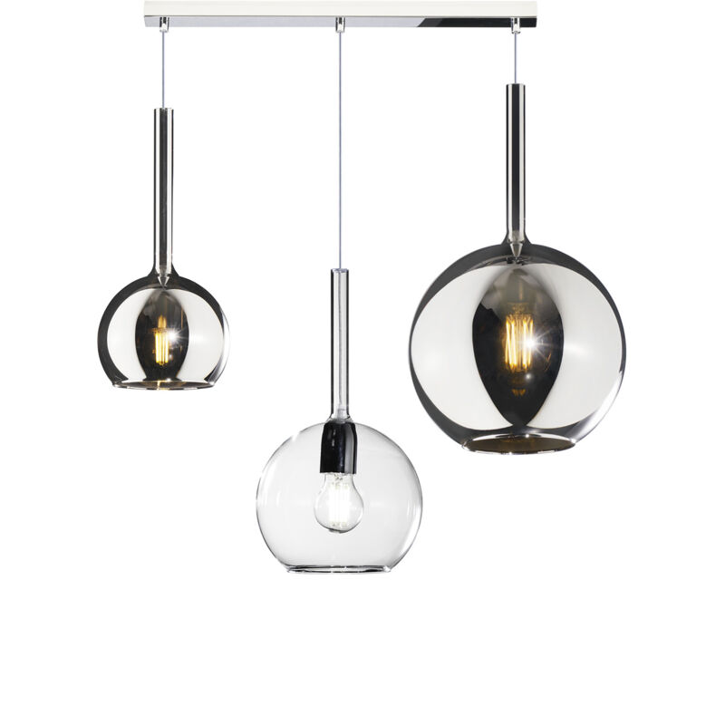 Collezione Future IL FUTURO DELLA LUCE È ADESSO Sospensione 3 luci dal rosone rettangolare con struttura in metallo finitura cromo e da 3 vetri tutti differenti nelle dimensioni colore trasparente e cromo.. Le finiture dei vetri cromo, rame, oro e ambra sono trattamenti superficiali che riducono solo parzialmente l'emissione luminosa. La finitura trasparente può essere naturalmente abbinata alle altre. Le strutture in metallo sono disponibili nelle finiture cromo, bianco e ottone satinato, con il diffusore in vetro disponibile in tutte le finiture esistenti. Possibilità di creare una composizione componibile in base ai componenti della sospensione scelti.Questo articolo è disponibile in diverse finiture e/o dimensioni. E' possibile indicarlo nell'apposito campo NOTE presente in conclusione di ordine oppure contattarci dopo aver effettuatol'ordine.