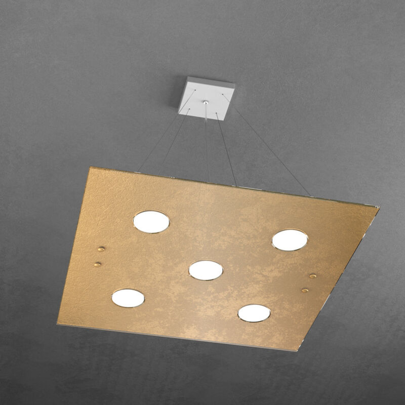 Collezione Path IL CAMMINO VERSO L'ILLUMINAZIONE SI FA BRILLANTE Plafoniera realizzata con lastre quadrate di vetro extrachiaro in finitura foglia oro, il cui lato a vista è trasparente con colorazione retrostante.. Il punto di forza del prodotto consiste nel non utilizzare dei led integrati ma una lampadina Gx53 che, una volta montata, arriva a filo della lastra di vetro e può essere facilmente sostituita dall'esterno. Disponibile anche nella finitura tortora scuro. Disponibile anche nella versione sospensione 5 luci più 2 in tutte le finiture disponibiliQuesto articolo è disponibile in diverse finiture e/o dimensioni. E' possibile indicarlo nell'apposito campo NOTE presente in conclusione di ordine oppure contattarci dopo aver effettuatol'ordine.