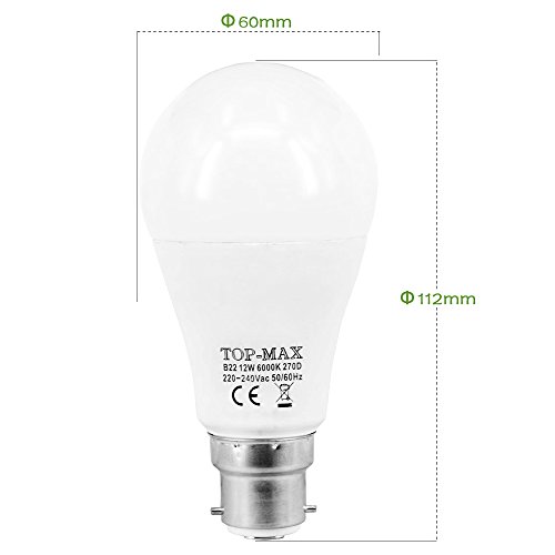 Top-max Lampadina Led sferica con attacco B22, 12 W, luce diurna bianca calda, lampadina a risparmio energetico equivalente a lampadina a incandescenza da 75 W, non dimmerabile, 2835 SMD, 930 lm, angolo di diffusione 270°, per interni, 6Pcs Day White, B22, 12.0 wattsW