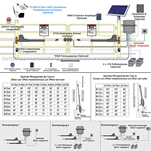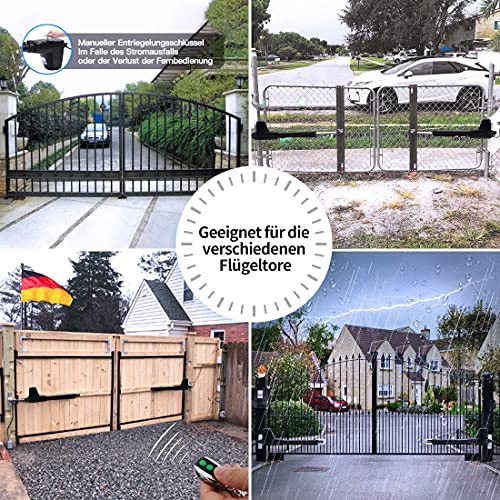 Ampia gamma di applicazioni: adatto per tutti i tipi di cancelli a doppia anta e perfetto per cancelli in acciaio, legno, vinile a forma di piastre, tubi e maglie della catena. Applicazione tipica comprende appartamento, cortile, pascolo, fattoria e ranch. Facile installazione fai da te con strumenti comuni, nessuna saldatura aggiuntiva. Sono inclusi tutti i componenti di montaggio e semplici istruzioni in tedesco e inglese. L'intera installazione richiede solo poche ore.