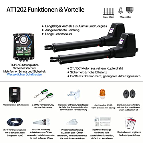 TOPENS AT1202 - Azionamento per cancello a battente a doppio battente, automatico, max. 5,5 m o 400 kg per ala con 2 telecomandi