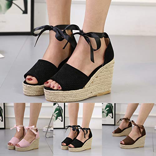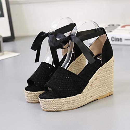 TOPEREUR Espadrilles, sandali da donna, con suola con plateau, lacci e zeppa, da spiaggia, da spiaggia, comodi sandali da spiaggia, Nero (Nero ), 37 EU