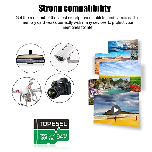 TOPESEL Scheda Micro SD da 64 GB, Scheda di Memoria MicroSDXC fino a 90 MB/s, UHS-I, classe 10, U3, Verde (3 pezzi)