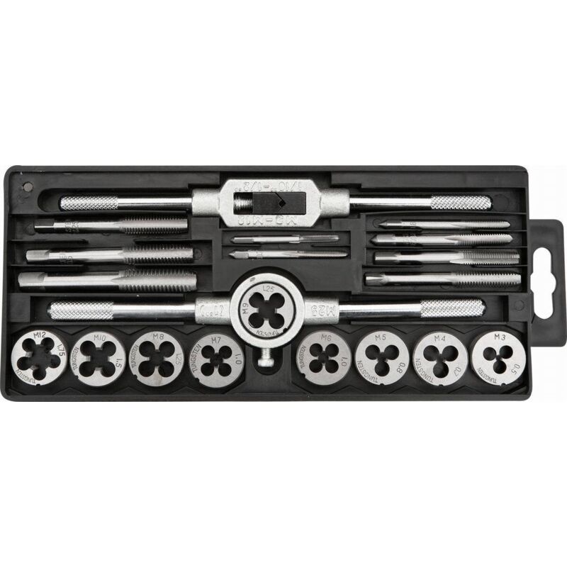 Composto da: 9 maschi, 9 filiere, portamaschi, portafiliere. Dimensioni Ø M3-M4-M5-M6-M7-M8-M9-M10-M12.