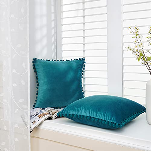 Topfinel Federe Cuscini per Divano Copricuscini Arredi Morbidi di Velluto con Pom Poms in Tinta Unita Cuscino Eleganti e Moderni per Casa Camera da Letto Salotto,2 Pezzi,45x45CM,Turchese