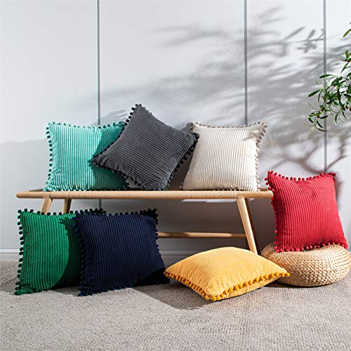 Topfinel Set di 2 Federe per Cuscino da 60 x 60 cm,in Velluto a Coste con Pompon, Copricuacini Decorazione per Interni, Fodere Cuscino per Divano,Bambini, Soggiorno,Camera da letto,Verde Turchese
