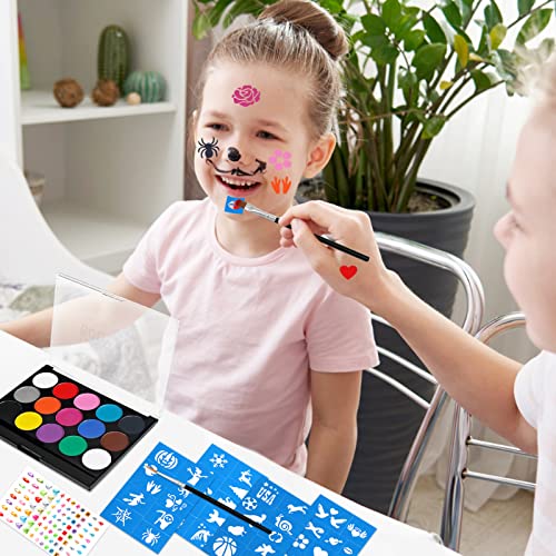 TOPJOWGA Trucco Bambini, Body Painting, 15 Colori Face Painting per Bambini, 4 Stencil per tatuaggi, 2 Pennelli, Pittura Facciale, Trucco Viso Bambini, per Feste in Maschera, Halloween, Carnevale (B)