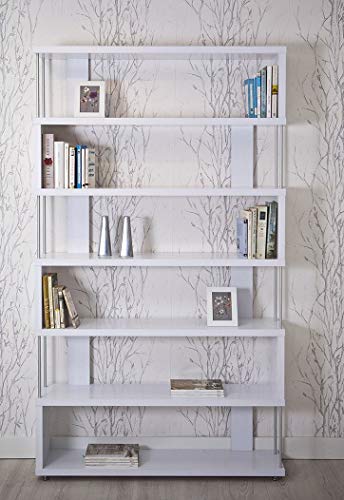Libreria modello zig-zag con laterali dotati di supporti metallici cilindrici di 12 mm di diametro.