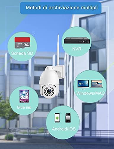 [Scheda SD e ONVIF] questa videocamera per esterni può supportare fino a 128 GB di scheda SD, ad esempio, una scheda SD da 64 GB supporterà fino a 20 giorni di registrazione video e riproduzione online, gli utenti possono facilmente cercare i file video tramite l'APP per smartphone. Se l'utente dispone di un NVR ONVIF, può essere connesso facilmente, ma non può supportare la ricerca tra sottoreti e deve trovarsi nella stessa LAN con l'NVR.