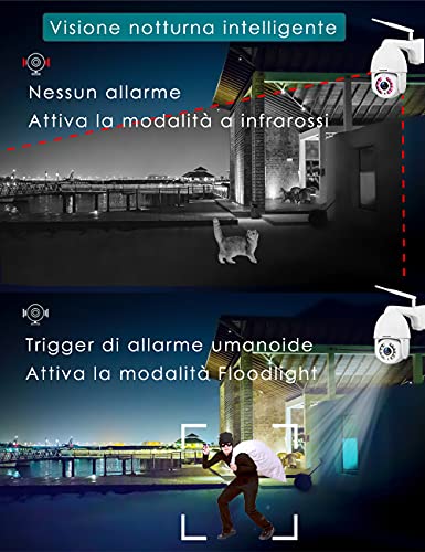 [Modalità di visione notturna intelligente] la telecamera per esterni Wi-Fi S21C dispone di LED multifunzione da 10 pezzi e può raggiungere una distanza di visione notturna fino a 130 piedi. Gli utenti possono impostare la modalità a infrarossi, la modalità colore e la modalità intelligente sull'APP. In modalità intelligente, la telecamera di sorveglianza accende la luce bianca quando il rilevamento umanoide attiva l'allarme e ripristina la modalità a infrarossi al termine dell'allarme.