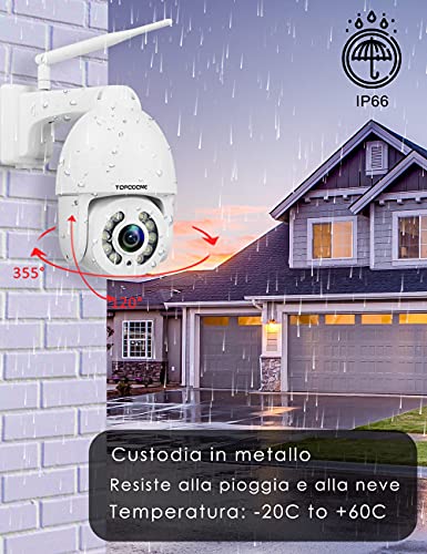 Topodome Telecamera WiFi Esterna senza fili, PTZ IP Dome Telecamera di Sorveglianza, 5 X Zoom Ottico, Visione Notturna con Luce Bianca (40 m), Audio a 2 Vie, ONVIF/APP per Smartphone/ IP66 (bianca)