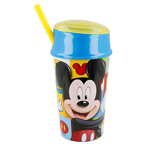 Topolino - Bicchiere Plastica con Coperchio e Cannuccia, tasca Snack 400 ml, Stor 22001)