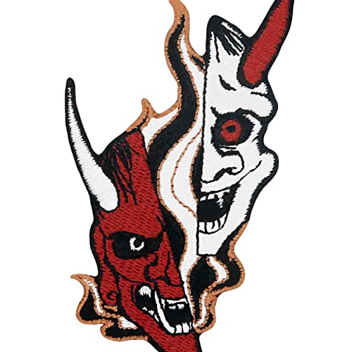 Toppa ricamata da applicare con ferro da stiro o cucitura, tema: Maschera giapponese Hannya Oni in bianco e nero