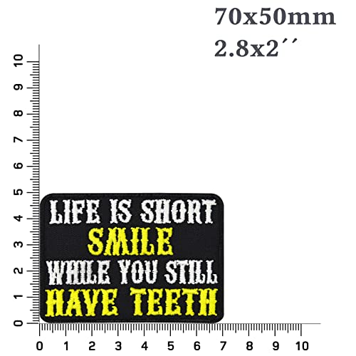 Toppa ricamata da applicare con ferro da stiro o cucitura: "Life is short - Smile while you still have teeth" Toppa Biker annodare/applicare ferro da stiro Rocker Regalo Applique tessuti | 50x70mm