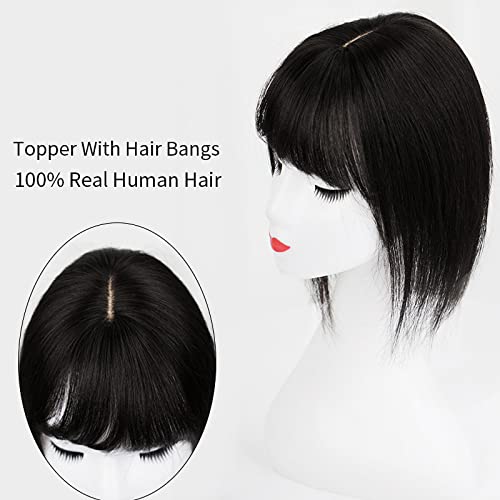 Eree Hair Topper dritto per capelli veri umani 100% con frangia, da donna Toupee, 10 x 11 cm, in seta, con clip in corona, extension per capelli per diradare i capelli, 30,5 cm, nero