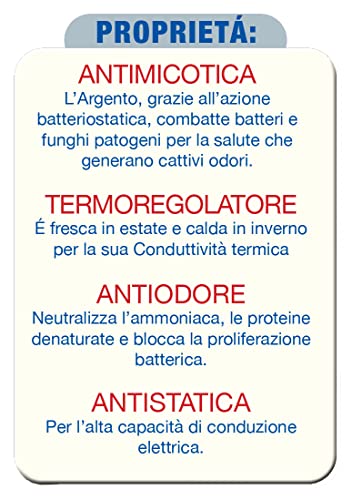 CARATTERISTICHE: Termoregolatore= grazie al tessuto di rivestimento e alla sua conduttività termica silver fresh è fresco d'estate e caldo in inverno -Antimicotico= L'Argento, grazie all'azione batteriostatica, combatte batteri e funghi patogeni per la salute-Antistatico= grazie all'alta capacità di conduzione elettrica-Antiodore= Neutralizza l'ammoniaca e blocca la proliferazione batterica.Dotato di 4 fasce angolari e