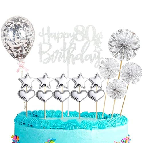 16 topper per torta con scritta "Happy 80th Birthday", argento per uomini e donne, decorazioni per torte con glitter personalizzati, decorazioni per torte per 80° compleanno, segno per torta