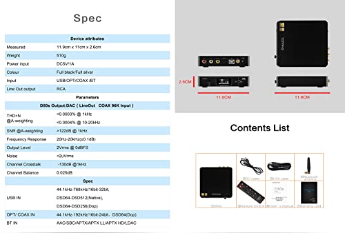 Prestazioni di decorazione potenti: USB di D50s supporta DSD64-DSD512 (Nativo) e PCM 16Bit/44.1KHz-34Bit/768KHz. Supporto coassiale e ottico più alto PCM 24Bit/192KHz e DOP DSD64