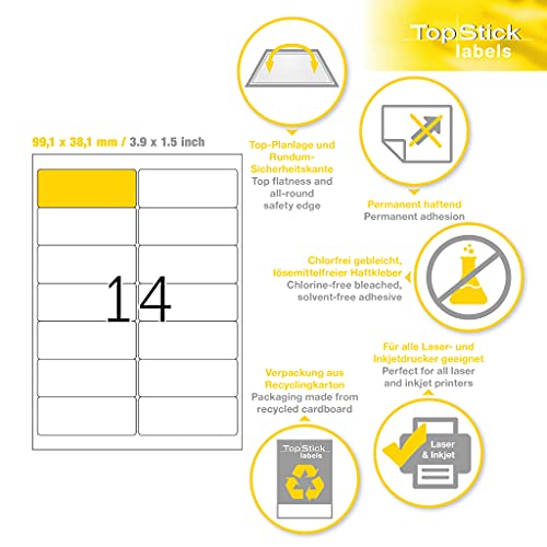 TopStick Etichette per Indirizzi, 99,1 x 38,1 mm, Etichette Adesive A4 per Stampante, 14 Etichette per Foglio, Bianco