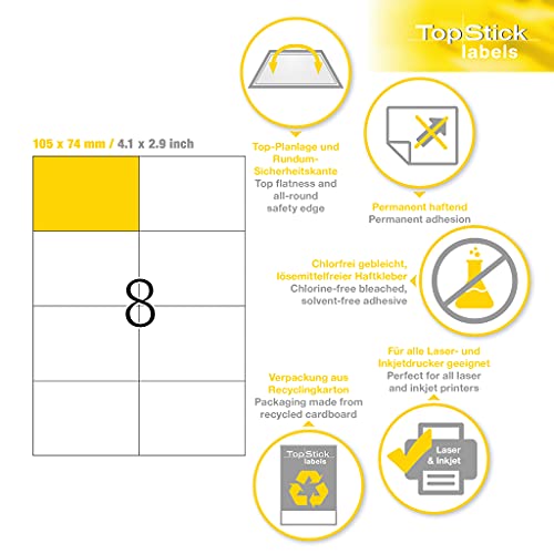 TopStick Etichette Universali, 105 x 74 mm, Etichette Adesive A4 per Stampante, 8 Etichette per Foglio, Bianco