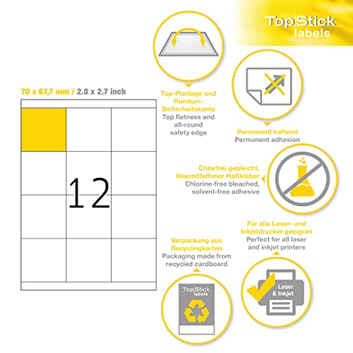 TopStick Etichette Universali, 70 x 67,7 mm, Etichette Adesive A4 per Stampante, 12 Etichette per Foglio, Bianco